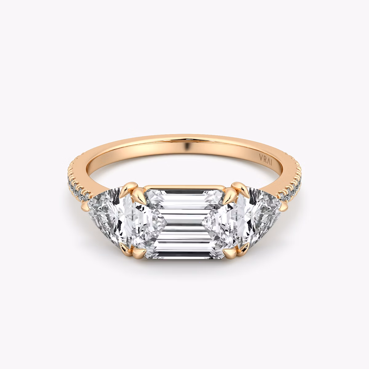 Select a north-south or east-west setting and your center diamond to complete your purchase; VRAI's design team will match your side stones in color grade for the perfect final touch.